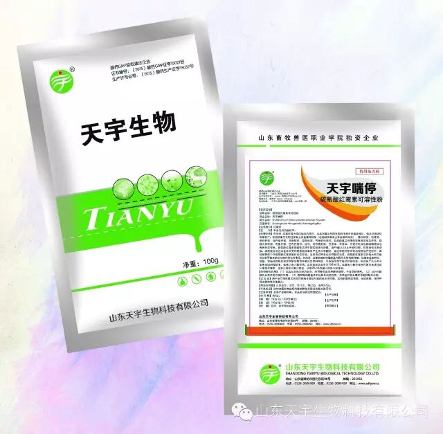 【用法用量】混饲,100g本品拌料100公斤;混饮,100g本品兑水200公斤,连用3-5日。重症加量。
