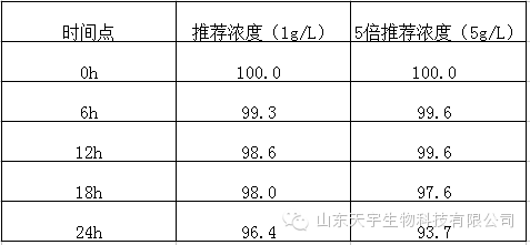 分别按照推荐浓度和5倍推荐浓度溶解于不同PH、不同硬度自来水中,本品可保证24小时后阿莫西林效价仍高于90%。可有效减少由于降解引起的药物失效、畜禽过敏等情况;延长一次配药的使用周期,较少劳动强度。